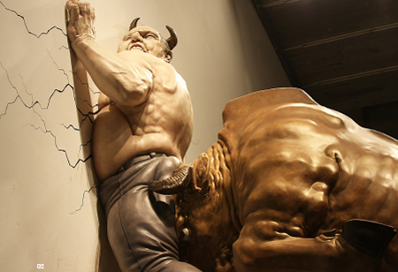 在这两件最新作品中,陈文令主动解构了以往的艺术思维模式,将文学性、戏剧化、大众媒体等要素转入自身的雕塑语言。尽管陈文令保持以往某些充满力量和动感的夸张手法,但他还是在创作的整体思路上进行了大胆的调整。首先是他在观念、语言和形式上以“超真性”(Hyper-Reality)来塑造一种鲜明的个性化风格,以摆脱了那种由民俗性、波普性、艳俗性符号所认定的话语模式。其次是他的政治经济学观点的转变,关注国际性的经济政治问题——把全球金融危机的个案作为视觉文化的分析对象,即选择了华尔街上竖立的著名“金牛”雕塑和“庞氏”金融骗子麦道夫作为创作对象。
